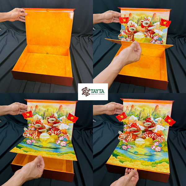 Trên thị trường Hộp Quà Tặng Doanh Nghiệp VN, thiết kế mô hình từ các layer popup gần đây đang là xu hướng được các nhà sản xuất theo đuổi. Nâng cấp hơn, tại TAYTA, chiếc hộp không chỉ đơn giản xếp gọn mô hình popup nữa, mà là xếp gọn mô hình khối 3D Lân - Rồng - hay kiến trúc và biểu tượng bất kỳ mà doanh nghiệp mong muốn.