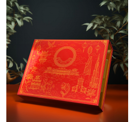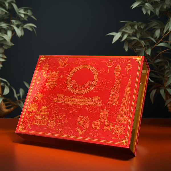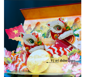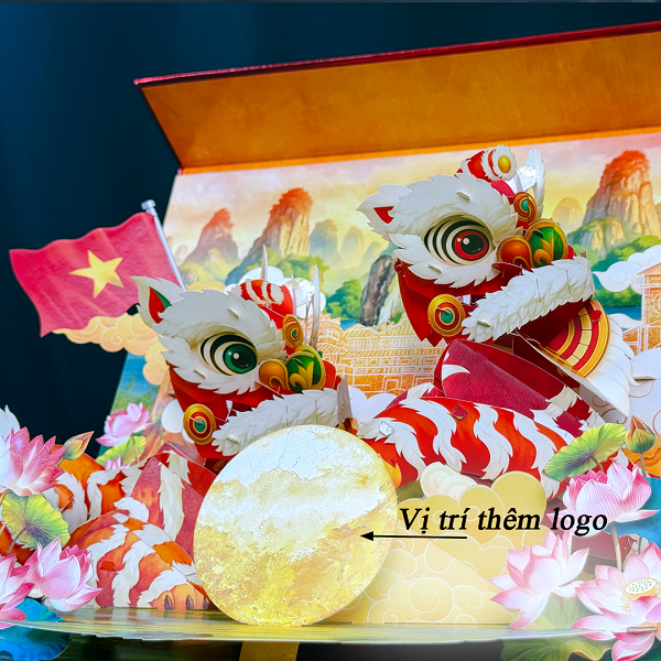 Hộp quà Tết - Trung thu 2025 "Song Lân Thưởng Ngọc" nổi bật với hình ảnh hai chú lân được tạo khối 3D cầu kỳ, kết hợp cùng vẻ đẹp sang trọng cùng vẻ ngoài của hộp quà in hoa văn mang đậm văn hóa, lịch sử Việt Nam như: hòn Trống Mái Vịnh Hạ Long, Ngọ Môn Huế, hoa sen, chim hạc...