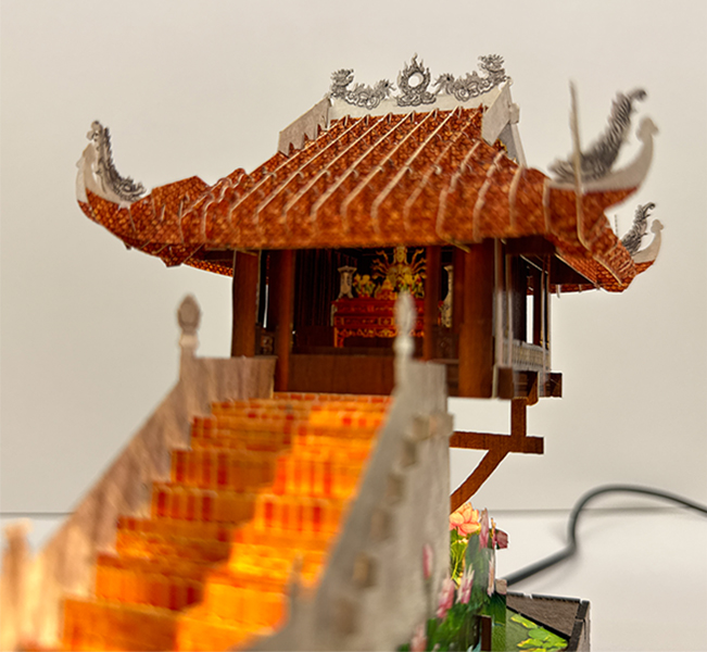 Thiệp 3D bìa gỗ Chùa Một Cột Hà Nội có đế đèn led chiếu sáng sang trọng