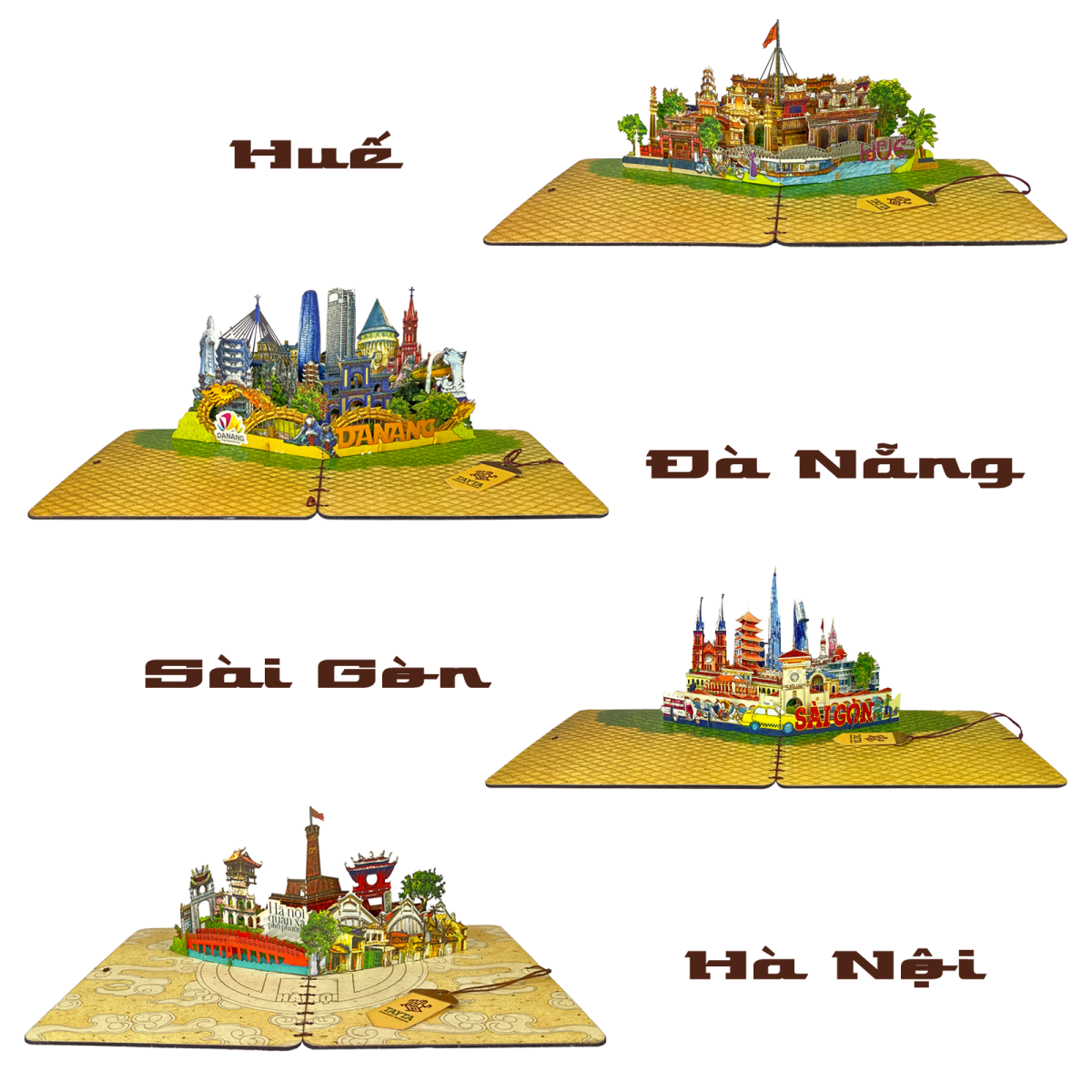 - Thiệp Popup Việt Nam của Tayta gồm 5 lớp hình ảnh, nổi bật với các địa danh nổi tiếng nhất 3 miền Bắc – Trung – Nam như: Chùa Một Cột Hà Nội, Ngọ Môn Huế, Nhà thờ Đức Bà Sài Gòn, Khuê Văn Các, Phu Văn Lâu, Bến Nhà Rồng,…
