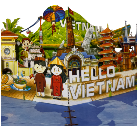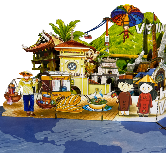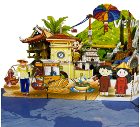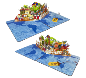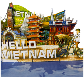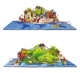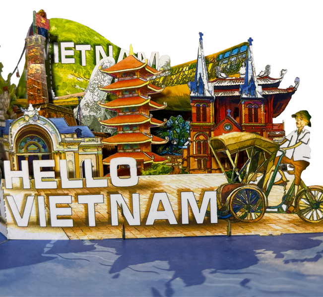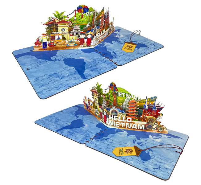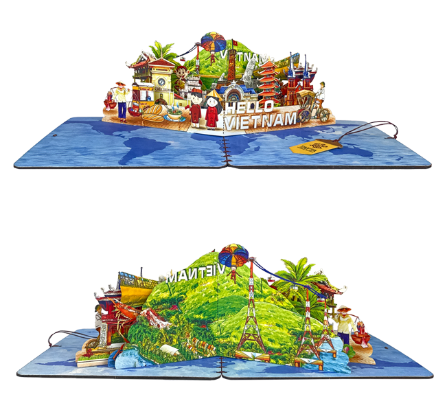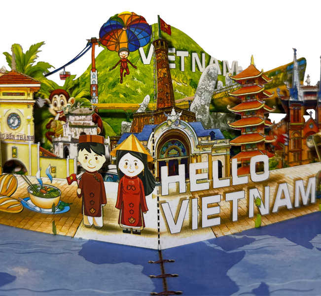 - Thiệp 3D - Popup Hello Vietnam do Tayta thiết kế, với sự phối hợp từ các lớp giấy cắt xếp theo thứ tự các địa danh nổi tiếng ở Bắc – Trung – Nam.