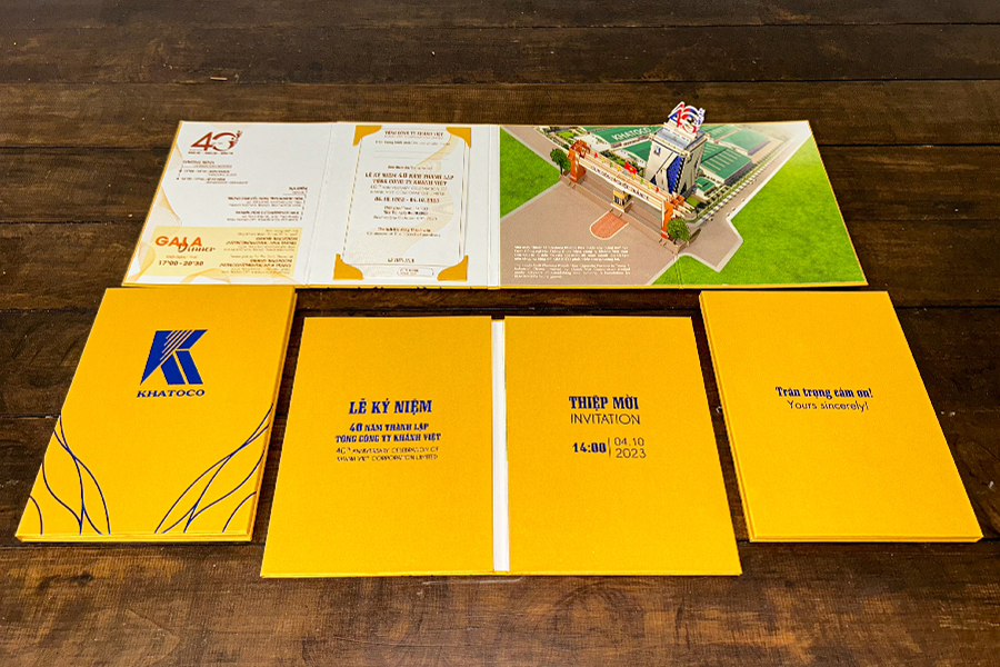 Ảnh: Một chiếc thiệp mời sang trọng với mô hình cầu kỳ + phần bìa cứng kết hợp với giấy mỹ thuật ánh kim cao cấp tương xứng với quy mô sự kiện của KHATOCO.