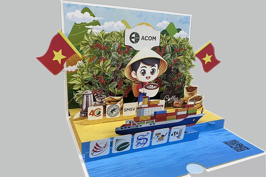 Ảnh: Chiếc thiệp 3D với đầy đủ thông tin về các đối tác, đại lý và tiêu chuẩn của sản phẩm ACOM xuất khẩu