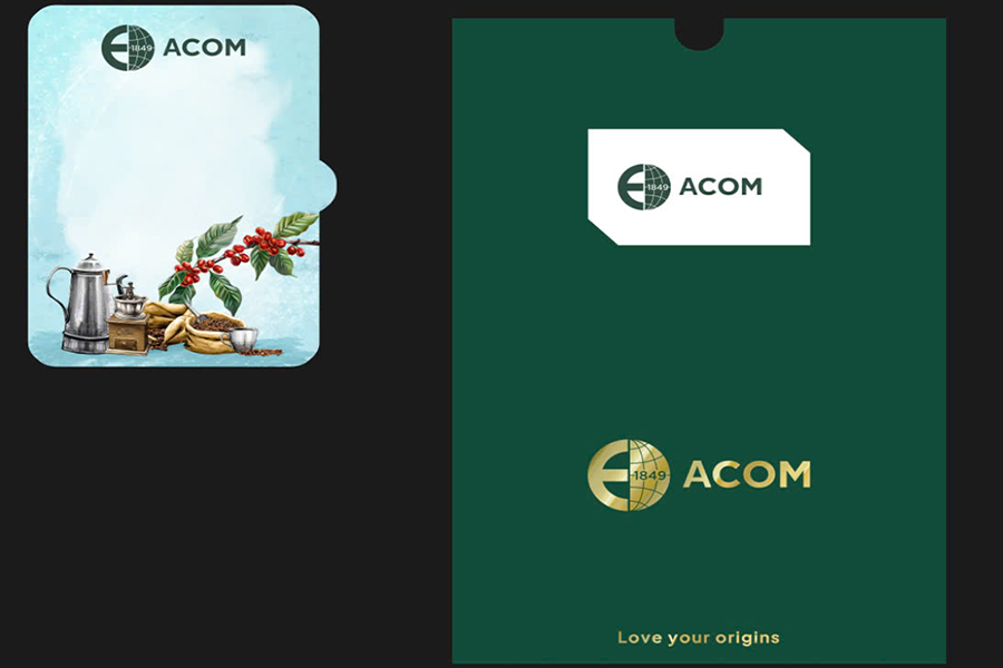 Ảnh: Phần bìa thiệp và giấy note đơn giản nhưng sang trọng với điểm nhấn chính là logo ACOM cùng hình ảnh sản phẩm cà phê “hảo hạng”