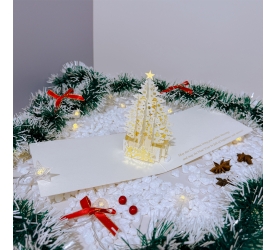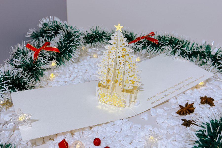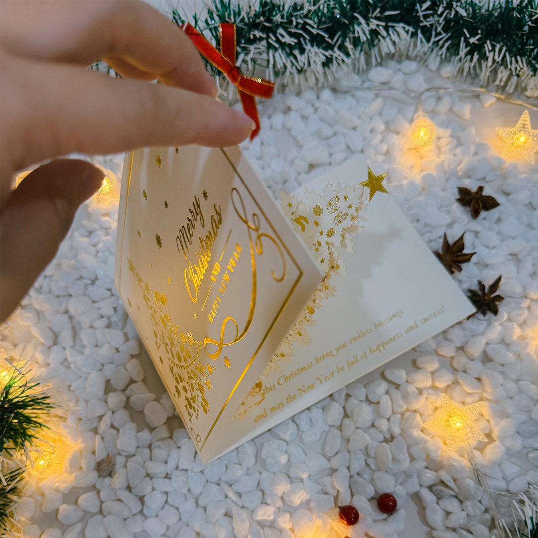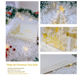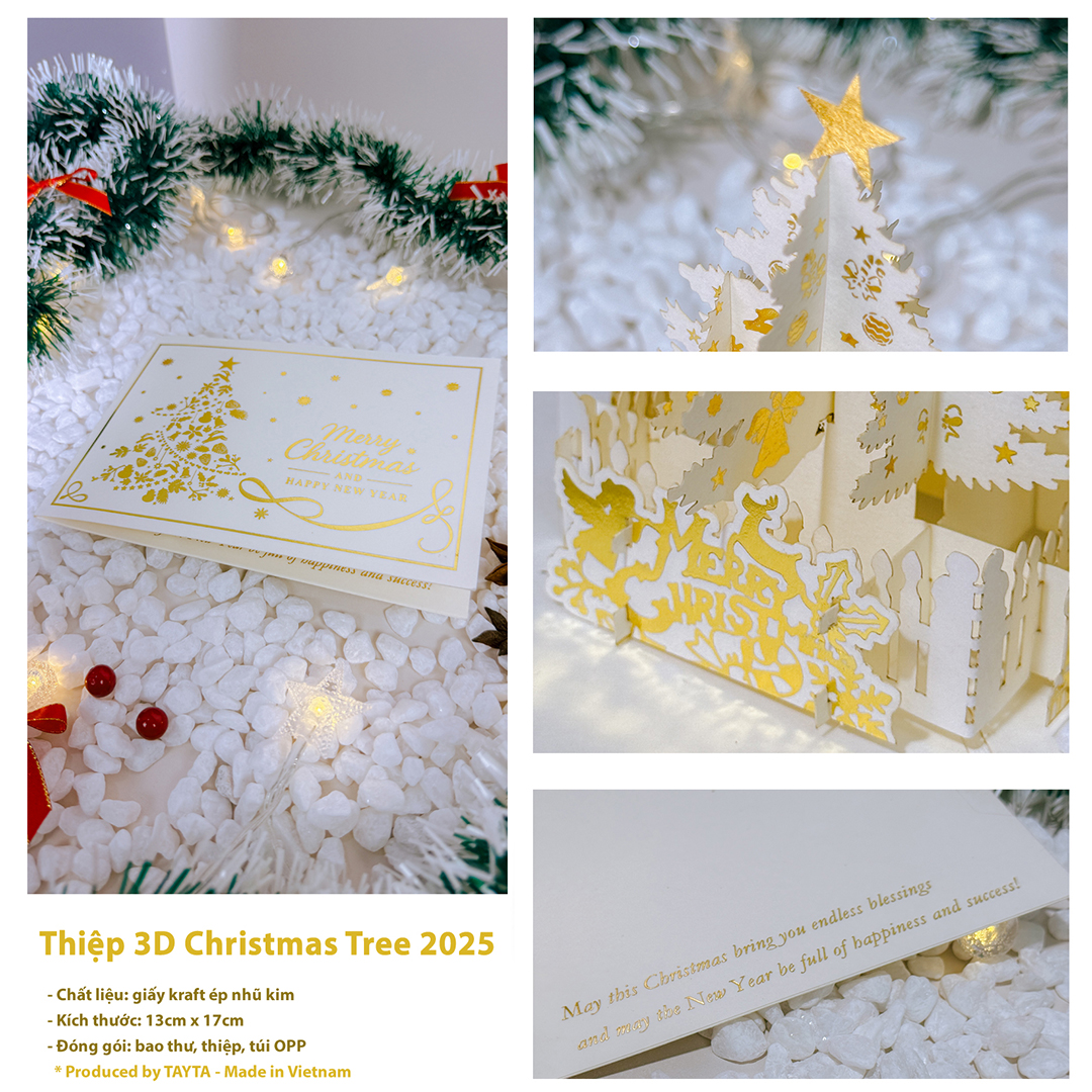 Thiệp 3D Giáng Sinh Hình Cây Thông Ép Kim nhũ kim lấp lánh, hứa hẹn mang đến một mùa Noel và năm mới rực rỡ. Hãy để chiếc thiệp 3D sáng tạo này trở thành lựa chọn quà tặng tinh tế, sang trọng cho người thân yêu dịp lễ này.