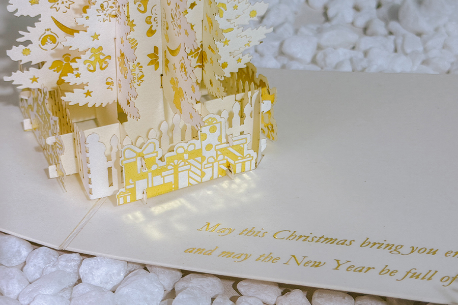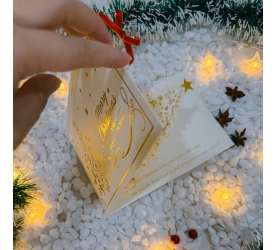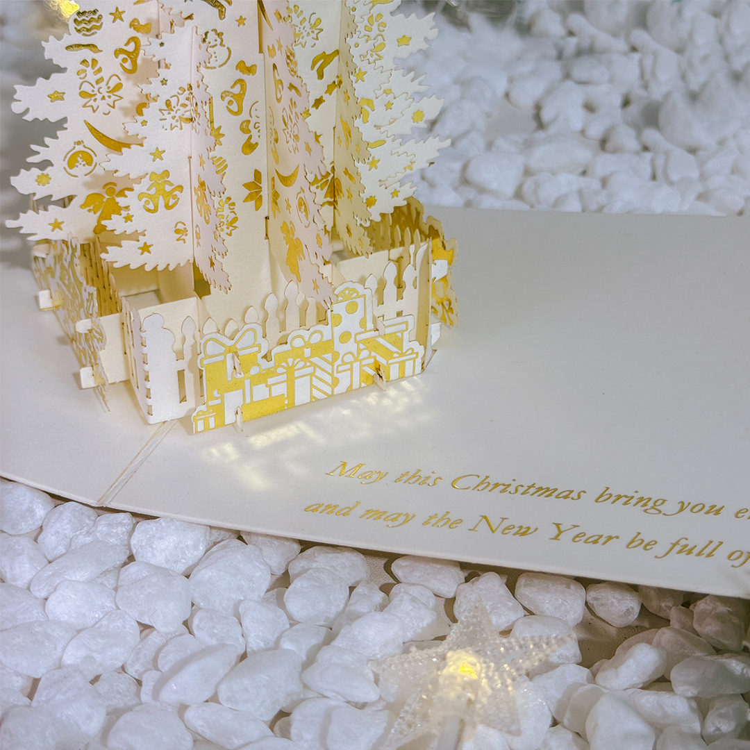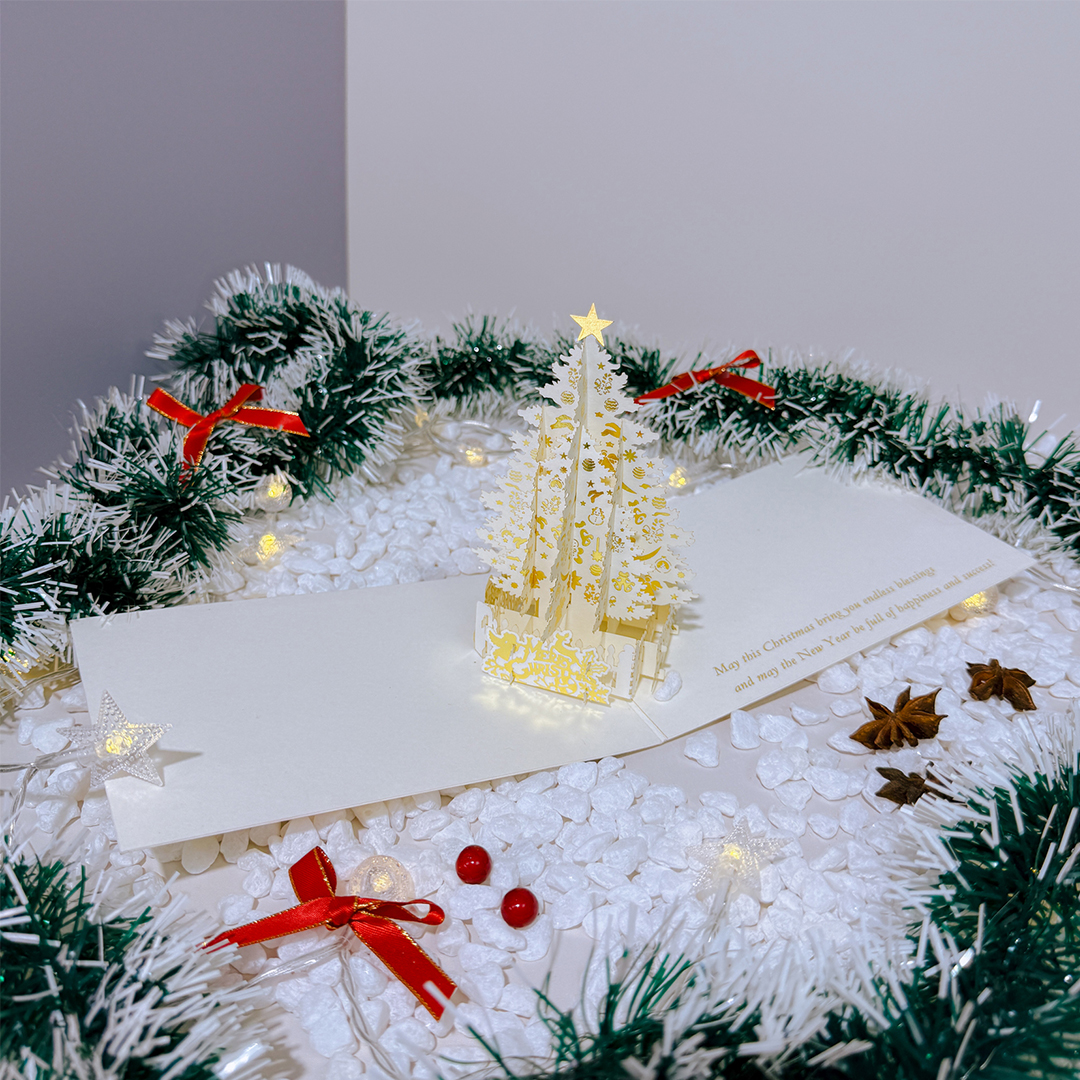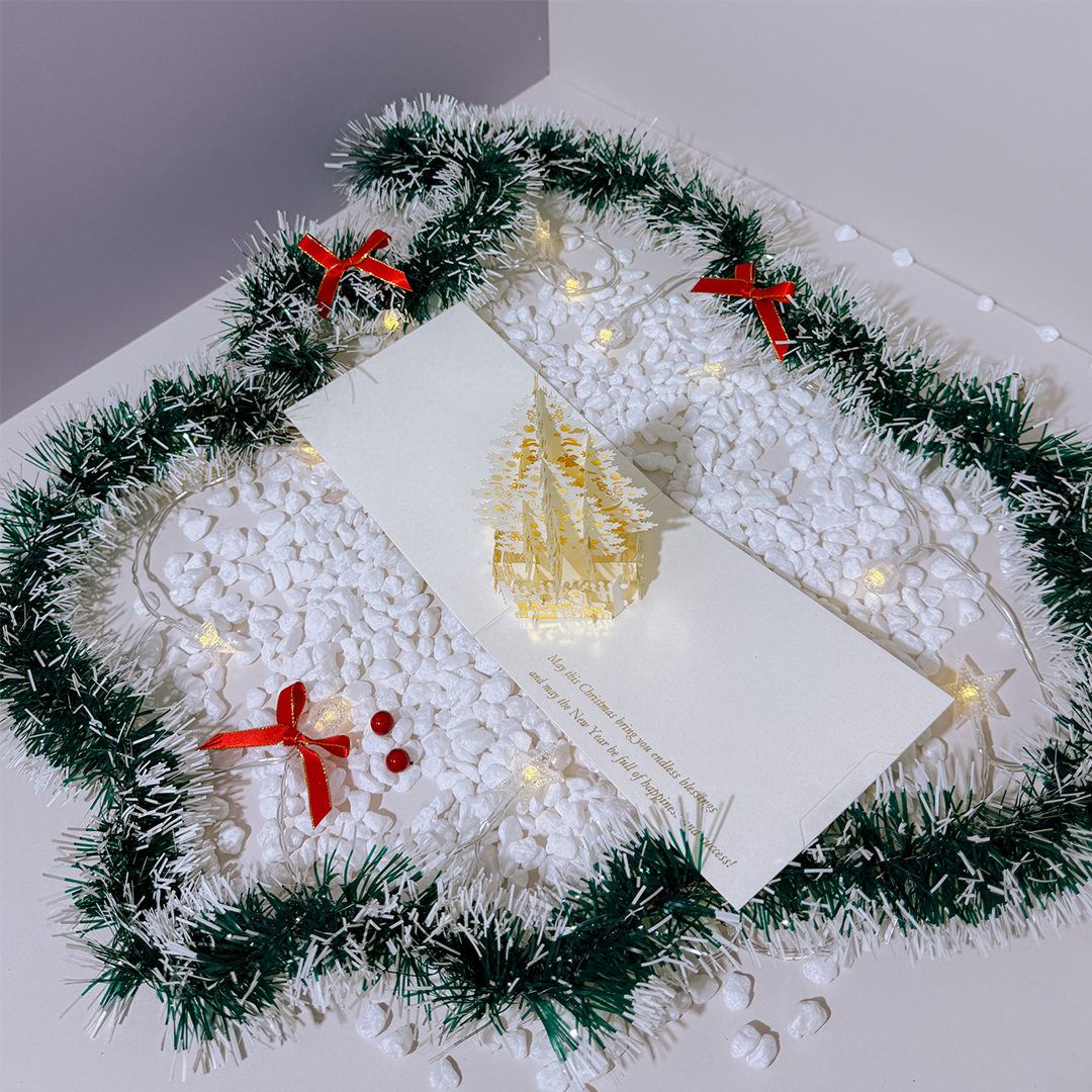 Thiệp 3D Giáng Sinh Hình Cây Thông Ép Kim nhũ kim lấp lánh, hứa hẹn mang đến một mùa Noel và năm mới rực rỡ. Hãy để chiếc thiệp 3D sáng tạo này trở thành lựa chọn quà tặng tinh tế, sang trọng cho người thân yêu dịp lễ này.