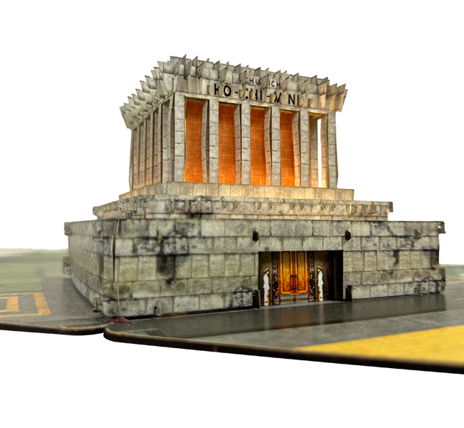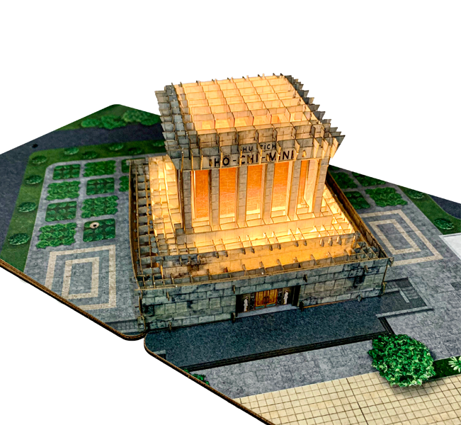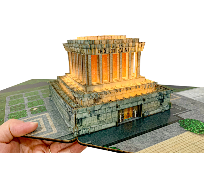 Thiệp 3D Lăng Bác nổi bật ở thiết kế gấp gọn mô hình trong bìa, tích hợp đèn led hiện đại giúp mô hình thêm nổi bật khi lên đèn. Bên cạnh đó, màu sắc chân thật là điểm cộng cho thể loại thiệp 3D này.